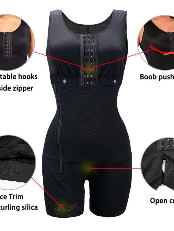Matériau double couche de haute qualité, contrôle du ventre à haute compression, crochets avant ajustables, entrejambe ouvert à fermeture éclair, ourlet en dentelle anti-frisure.