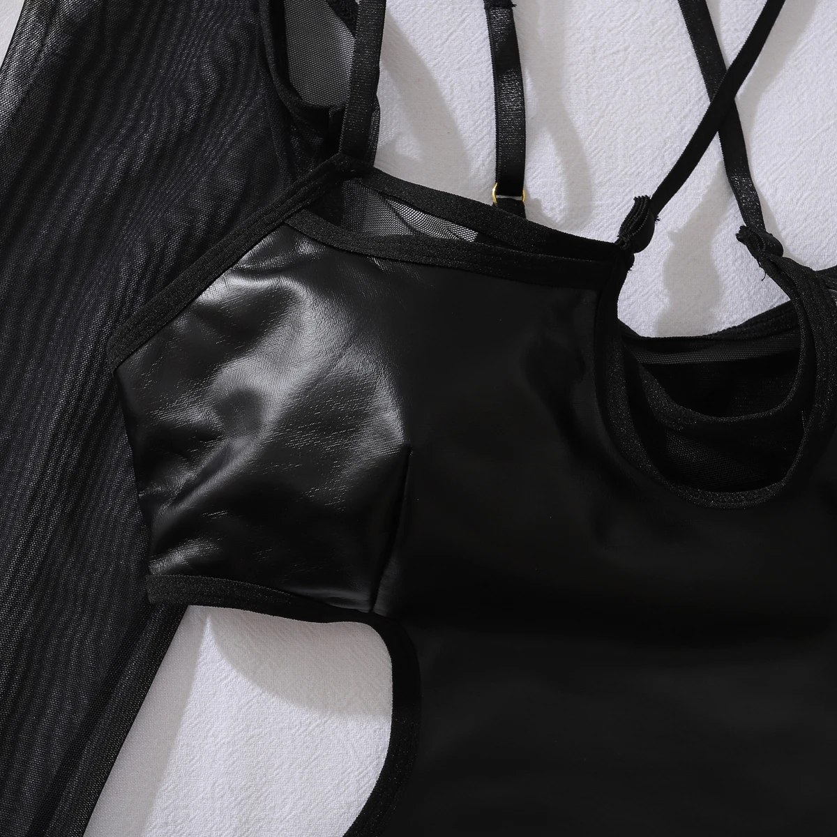 Cette combinaison en cuir PU avec maille transparente est parfaite pour les femmes qui recherchent une tenue audacieuse, élégante et moderne, idéale pour sublimer la silhouette avec style.