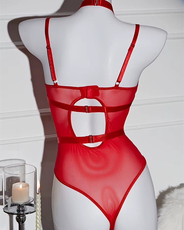 Soyez le premier à laisser votre avis sur “Combinaison sexy femme – Body ajouré en maille et cuir PU, col licou et coupe moulante”