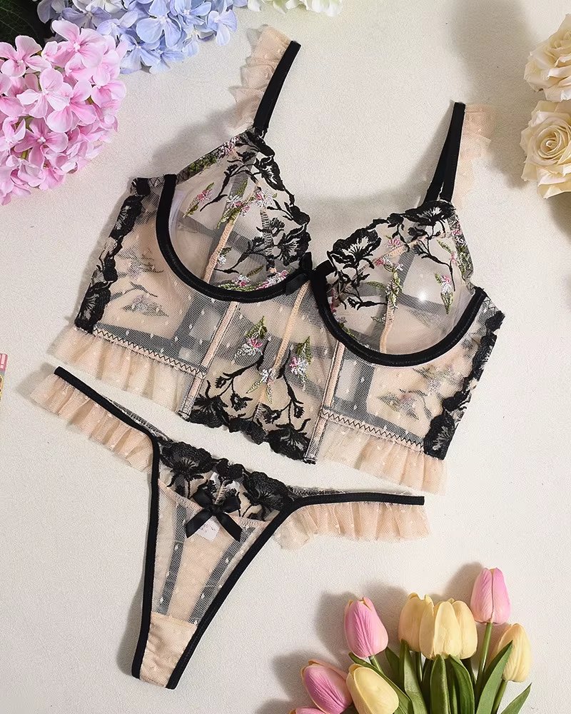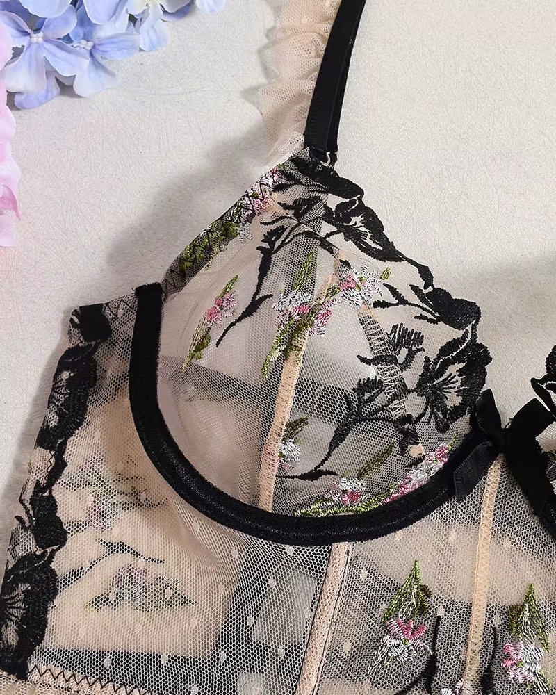 Cet ensemble de lingerie en dentelle florale est parfait pour celles qui recherchent une lingerie élégante, délicate et actuelle, alliant raffinement, maintien et style.