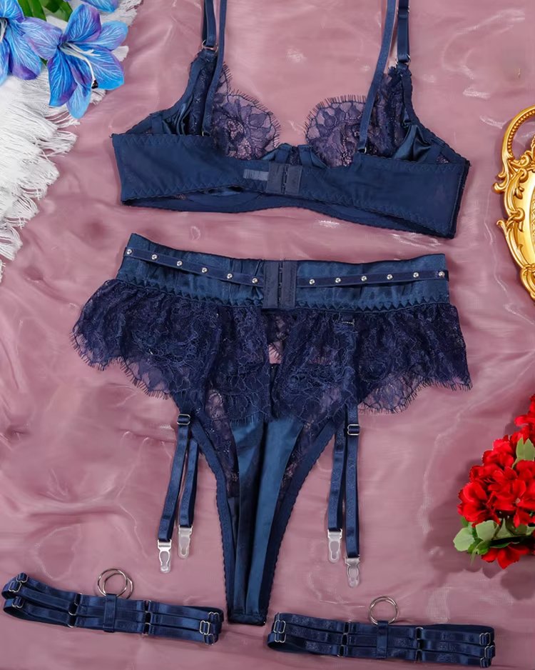 Ensemble lingerie femme 4 pièces – Dentelle transparente et jarretelles élégantes