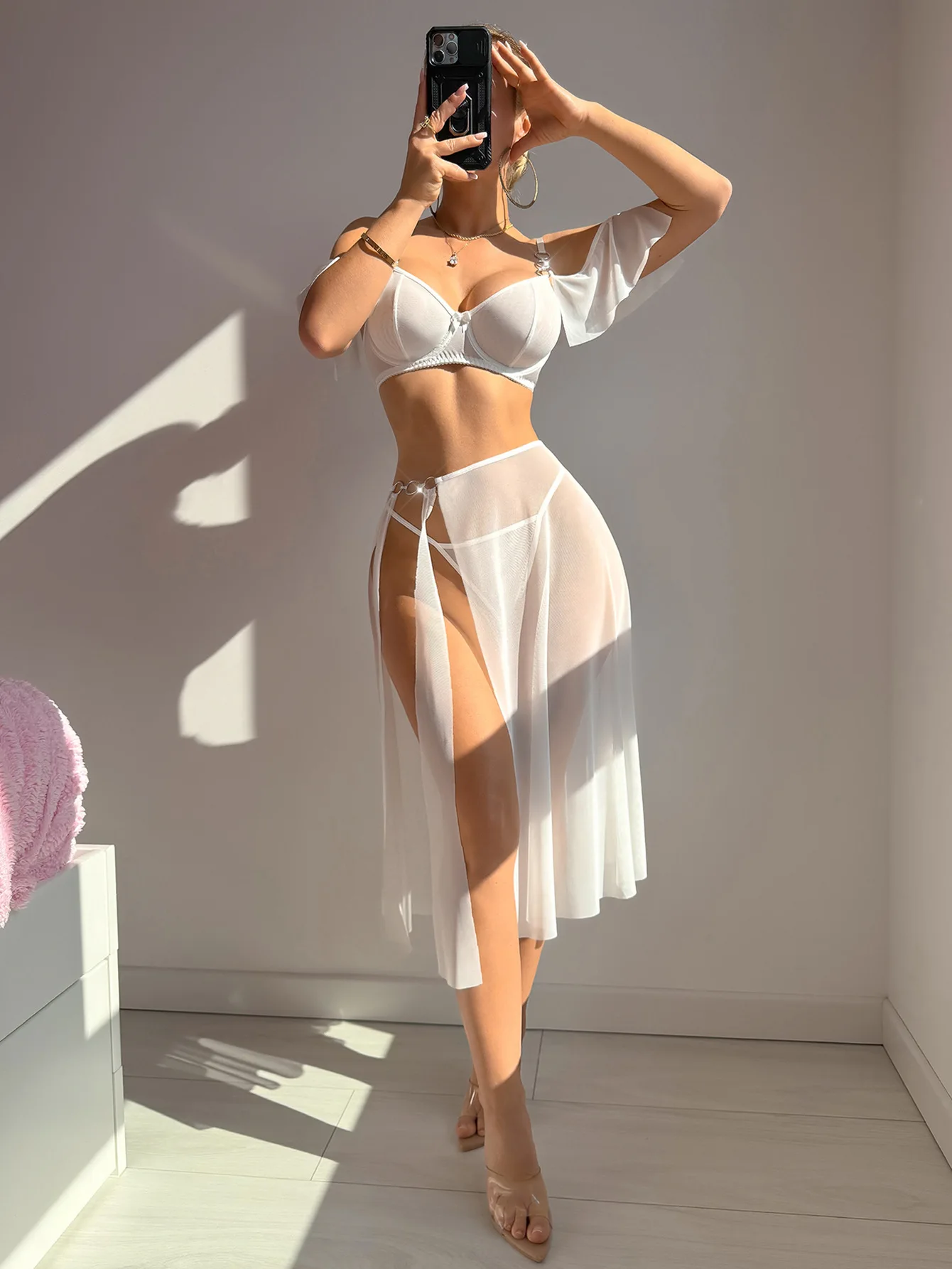 Découvrez cet ensemble de lingerie élégante pour femme, composé d’un soutien-gorge à volants délicats et d’une jupe en maille transparente à fente haute. Son design épaules dénudées met en valeur la silhouette tout en offrant une allure raffinée et féminine.