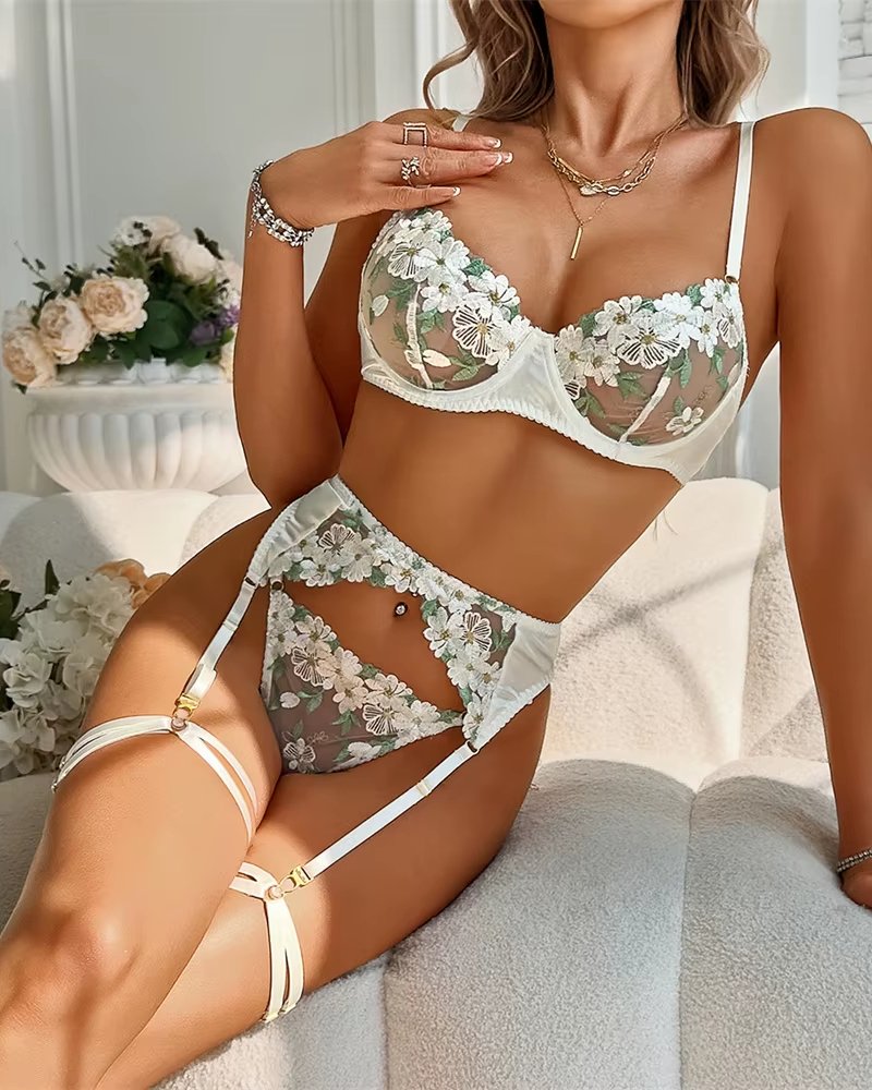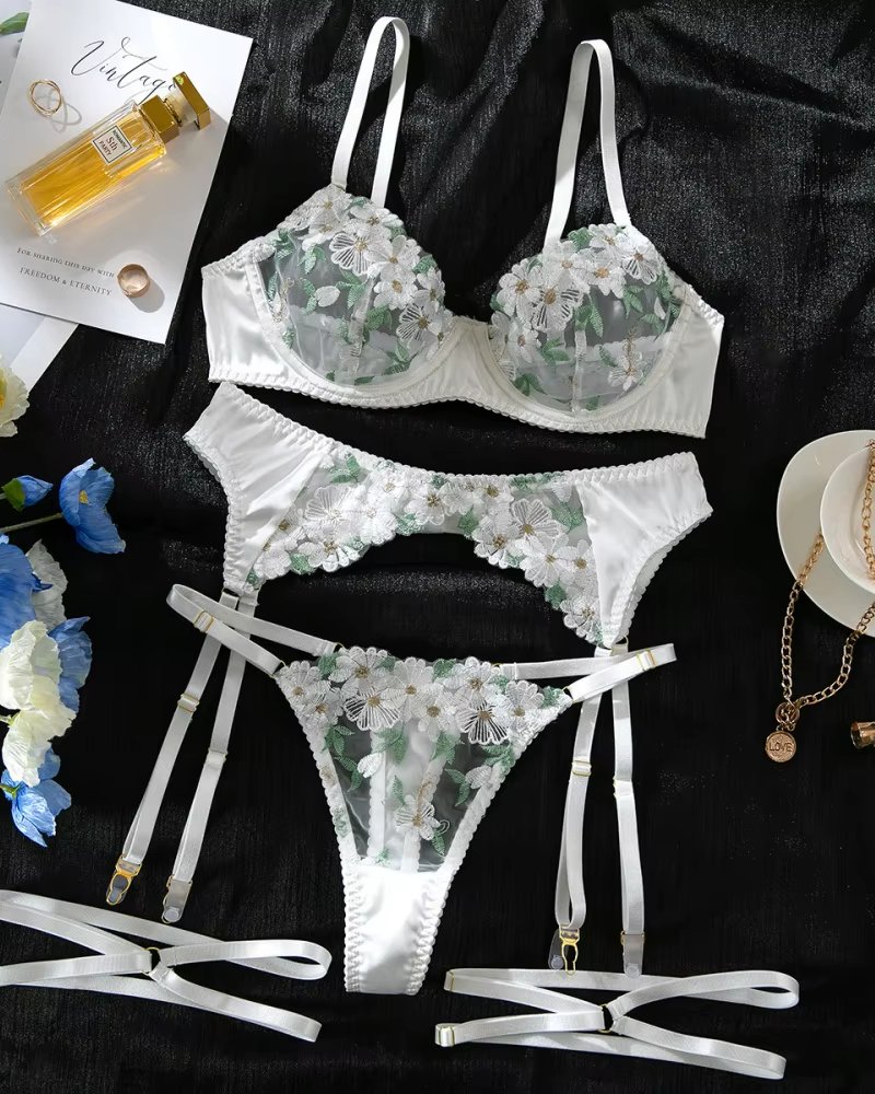 Laissez-vous séduire par cet ensemble de lingerie luxe blanc pour femme, composé de 4 pièces coordonnées : soutien-gorge, string, jarretelles et éléments assortis. Réalisé en maille pure et transparente, il est sublimé par de délicates broderies florales qui apportent une touche romantique et sophistiquée.