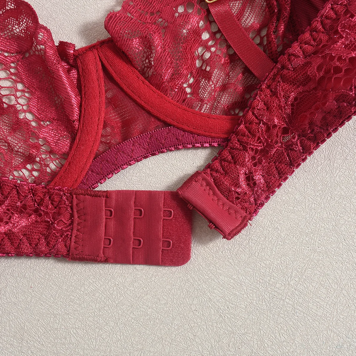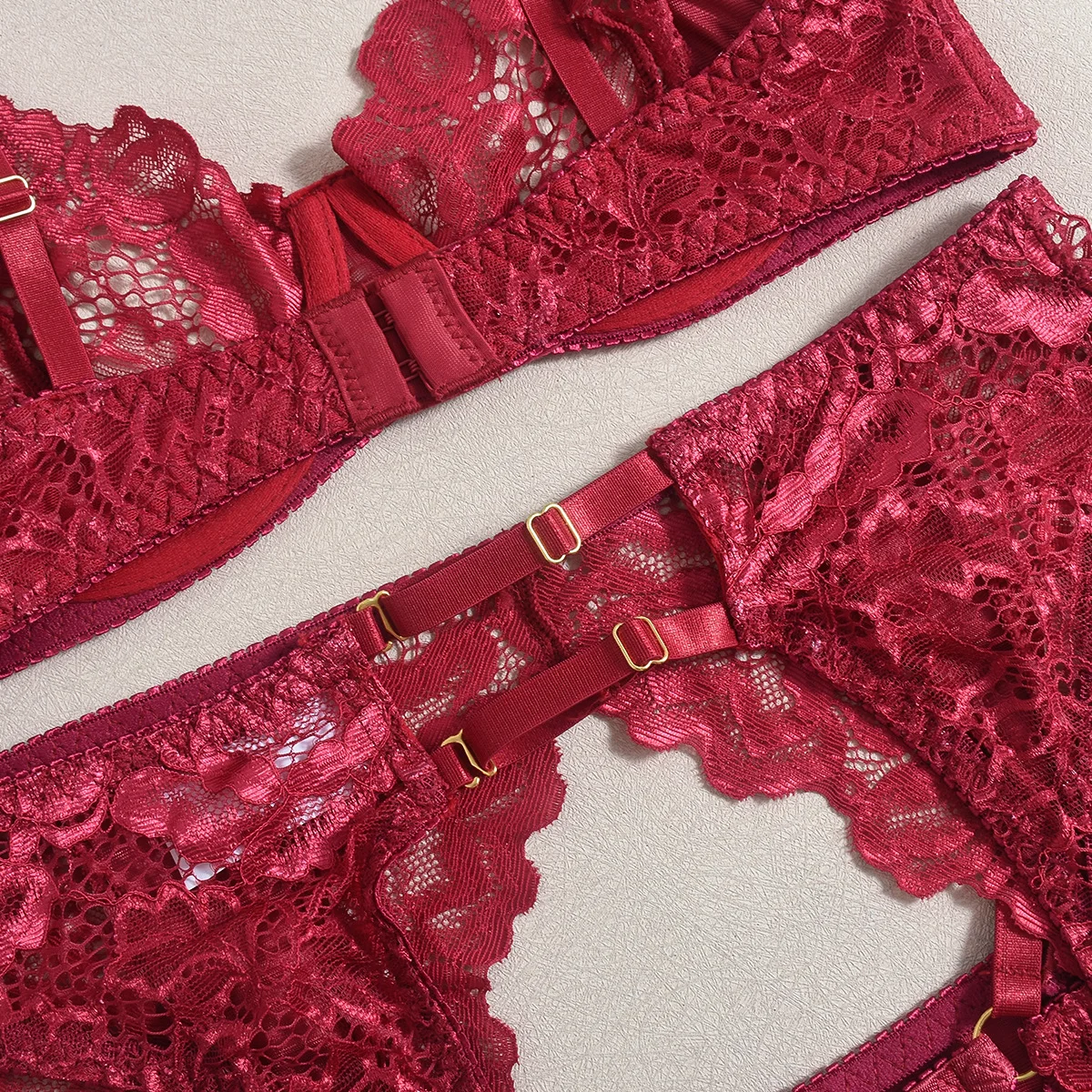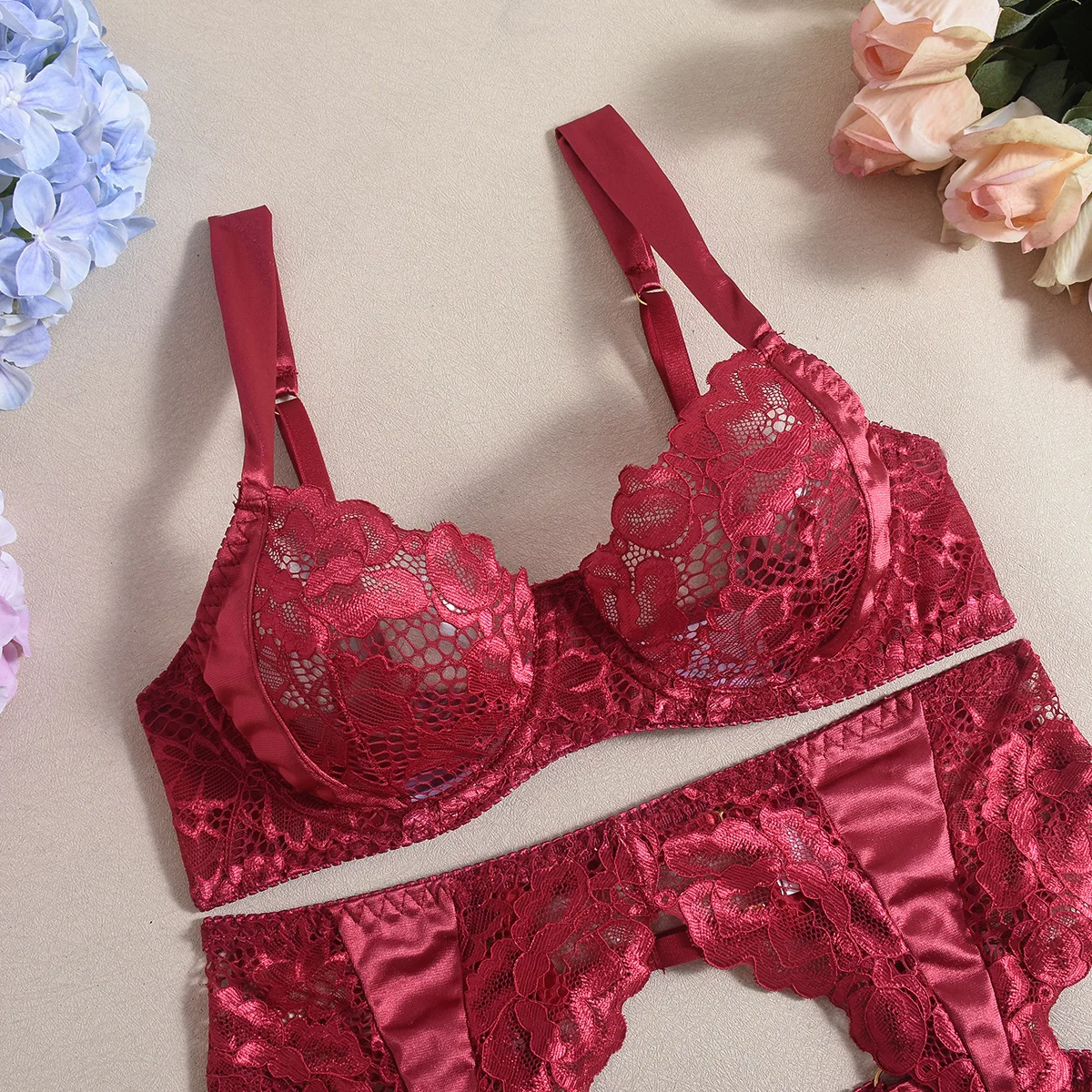 Cet ensemble de lingerie en dentelle brodée avec porte-jarretelles est parfait pour celles qui recherchent une lingerie intime élégante et séduisante, alliant charme, finesse et modernité.