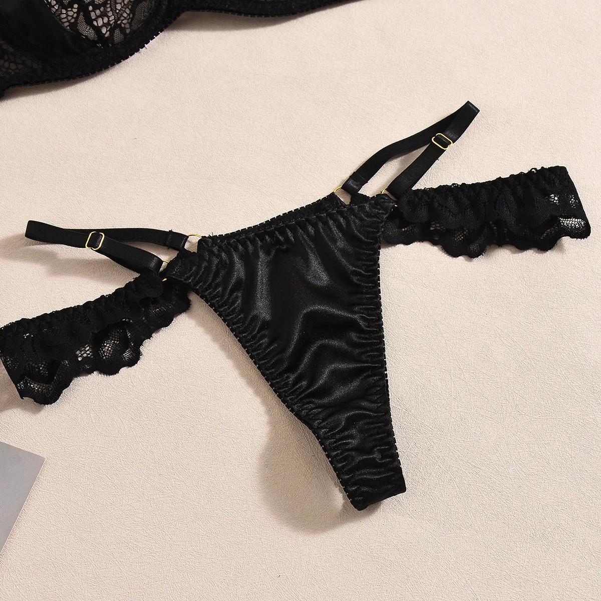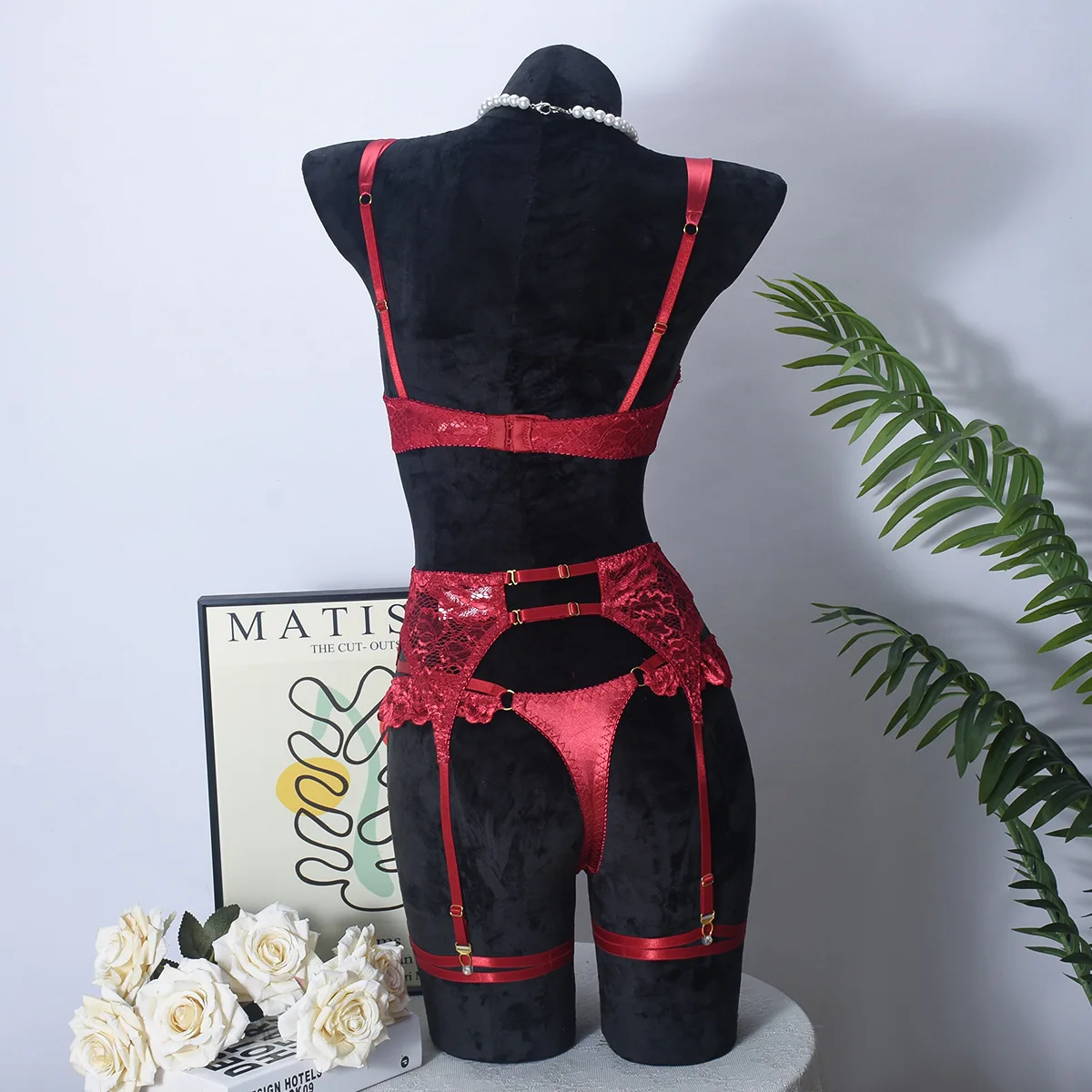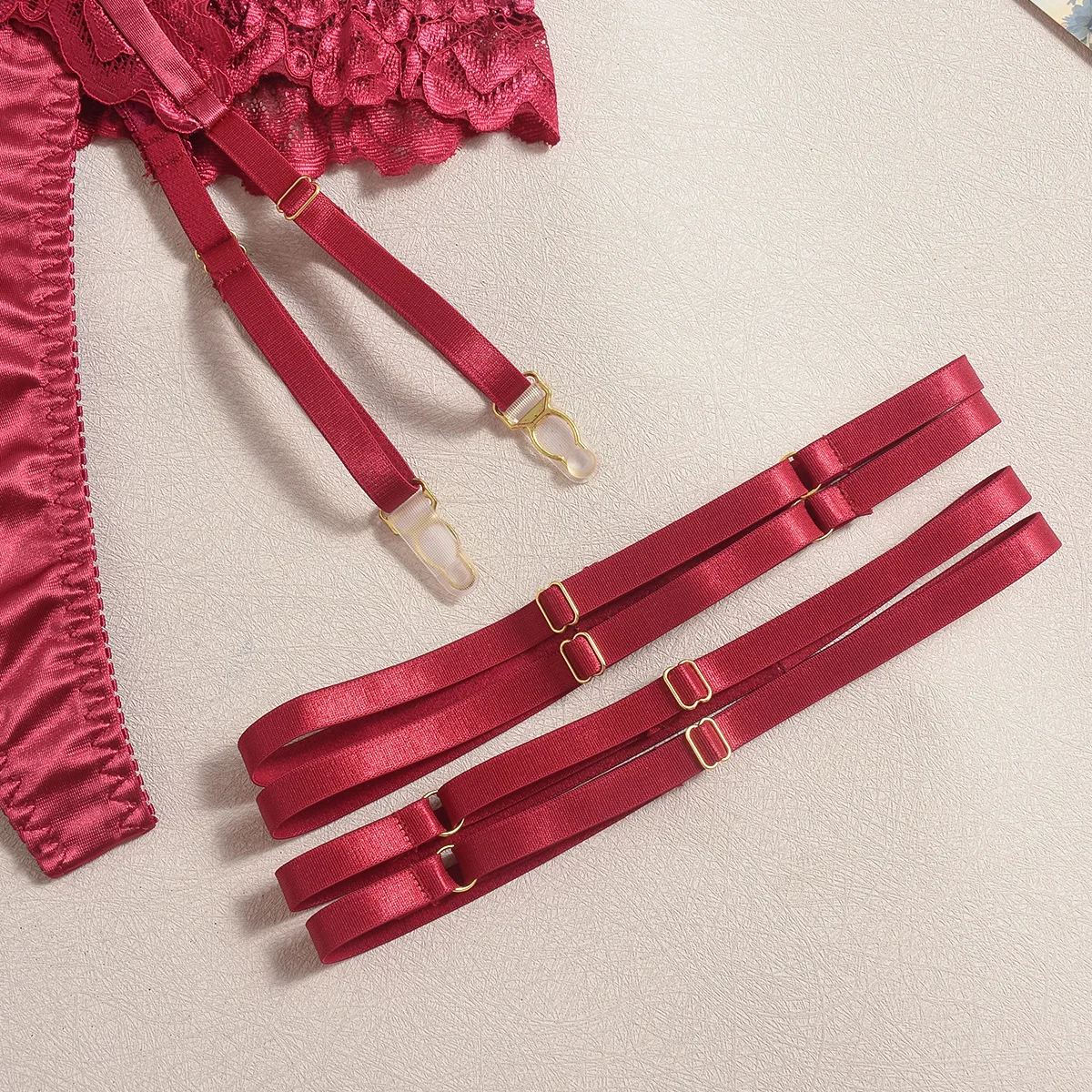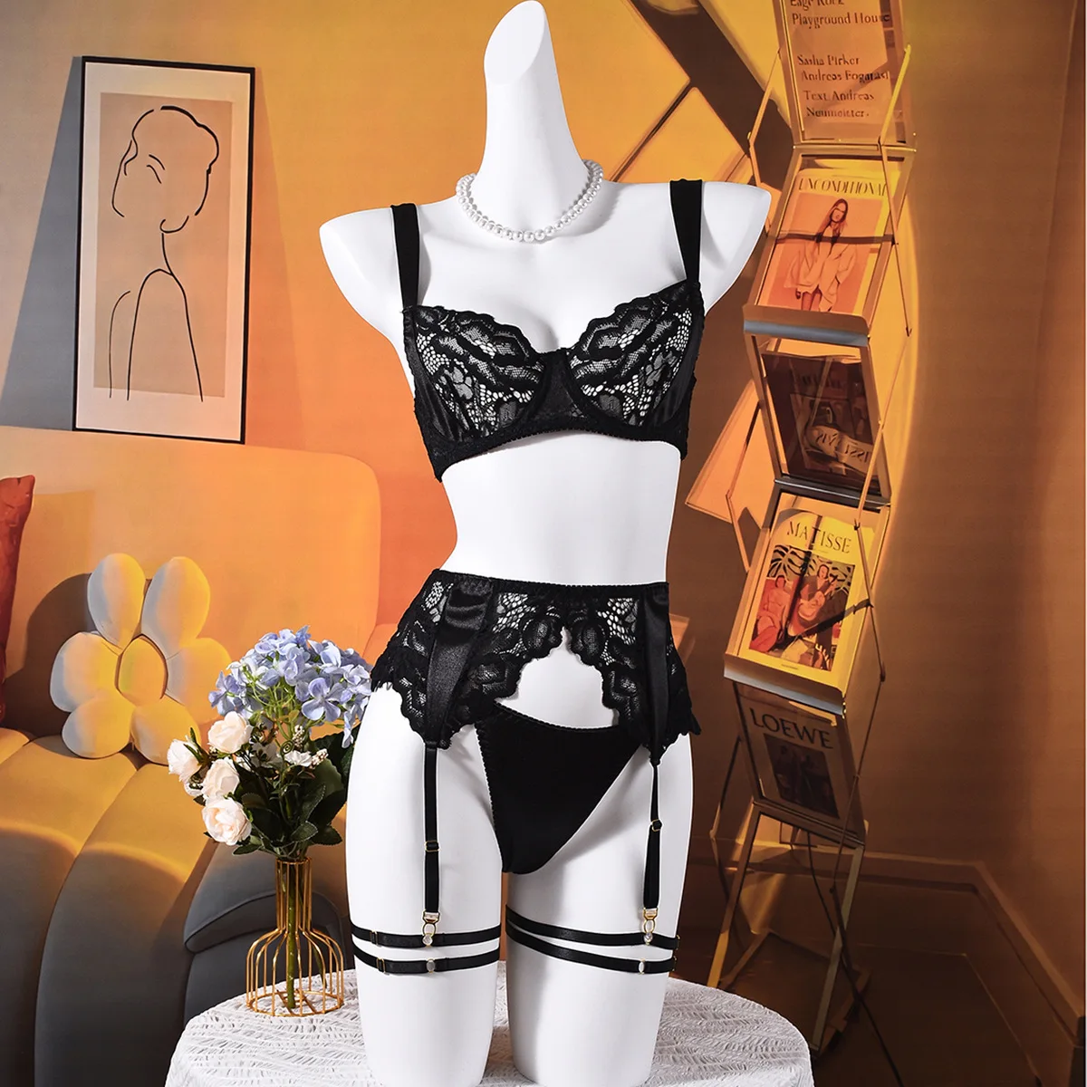 Cet ensemble de lingerie en dentelle brodée avec porte-jarretelles est parfait pour celles qui recherchent une lingerie intime élégante et séduisante, alliant charme, finesse et modernité.