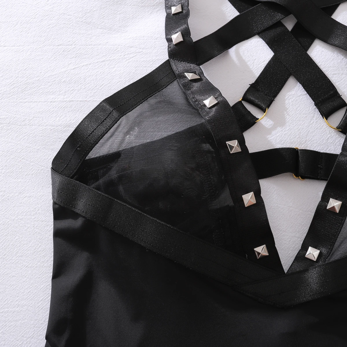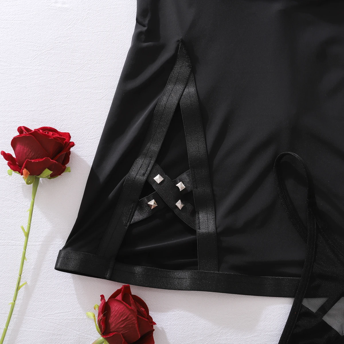 Cet ensemble lingerie avec jupe moulante et rivets est parfait pour les femmes qui souhaitent une lingerie moderne, élégante et affirmée, idéale pour sublimer la silhouette avec caractère.