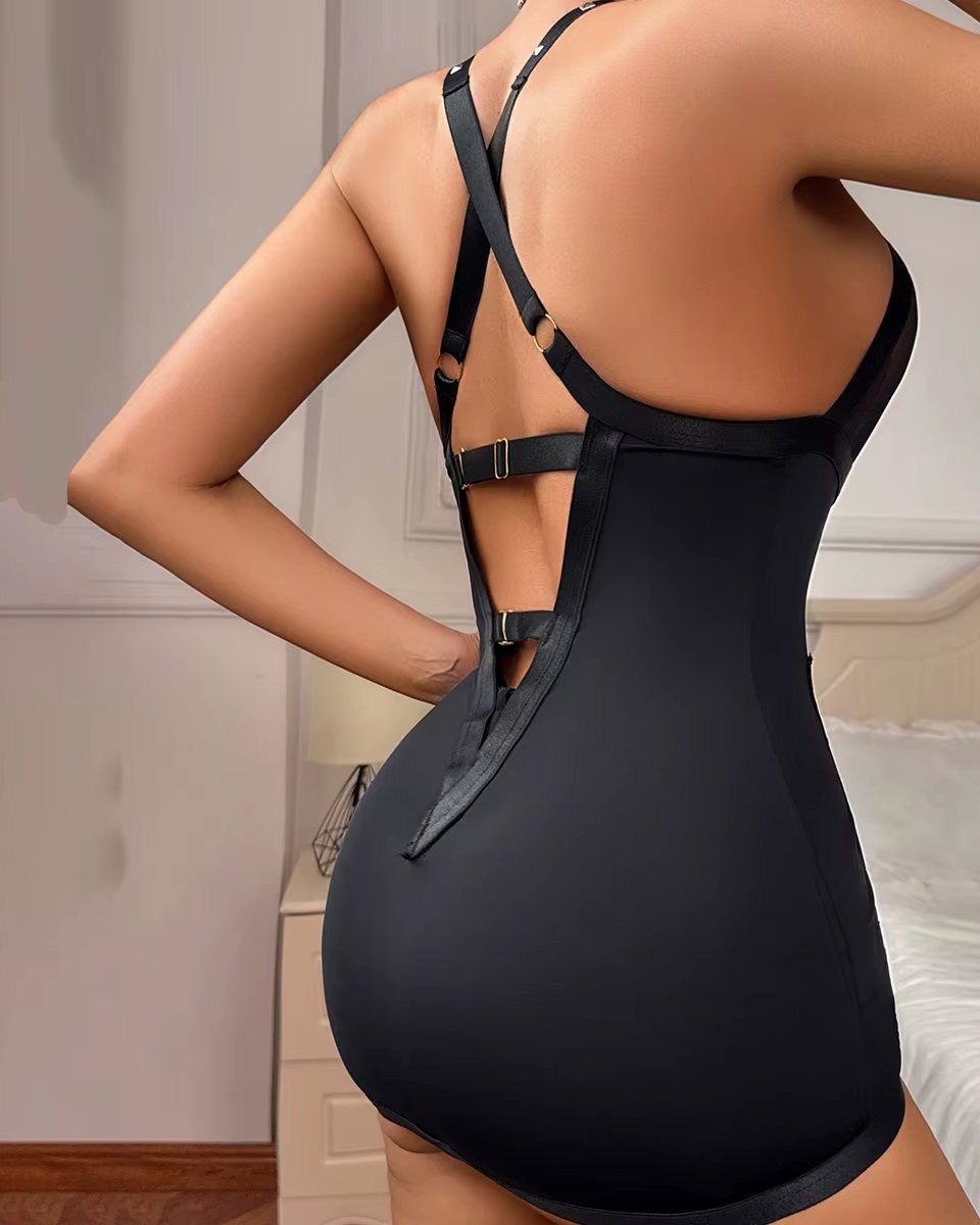 Cet ensemble lingerie avec jupe moulante et rivets est parfait pour les femmes qui souhaitent une lingerie moderne, élégante et affirmée, idéale pour sublimer la silhouette avec caractère.