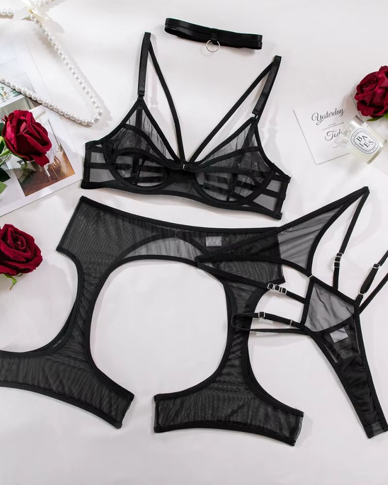 =Découvrez cet ensemble de lingerie femme 4 pièces en maille noire transparente, conçu pour allier élégance, modernité et féminité. Cet ensemble comprend un soutien-gorge sans doublure, une culotte assortie, un porte-jarretelles et un tour de cou décoratif pour un style complet et tendance.