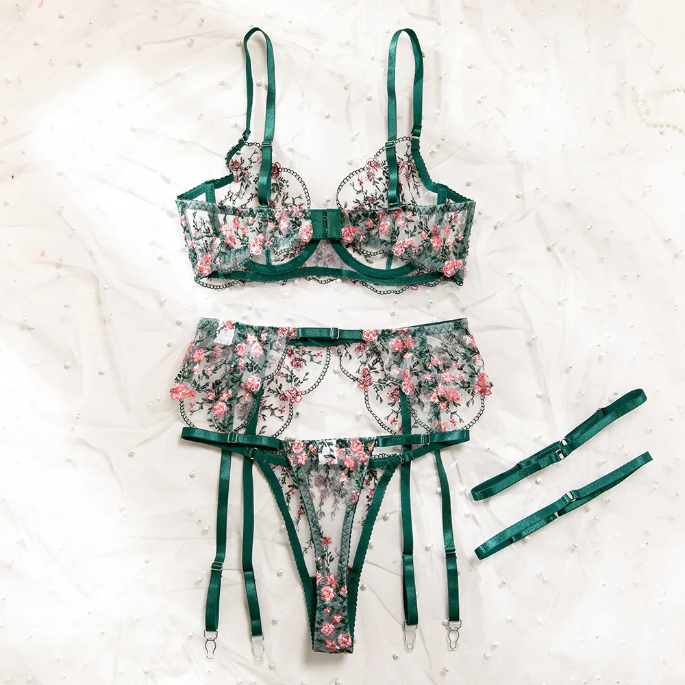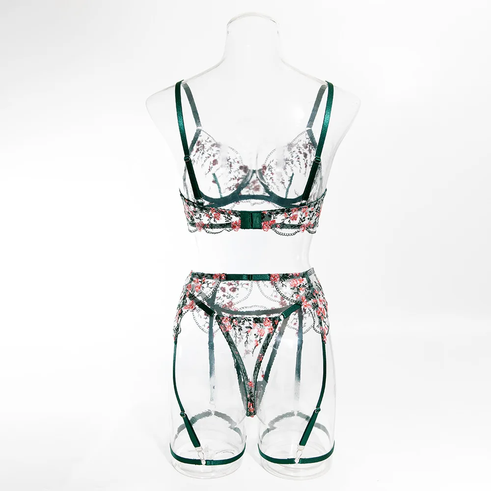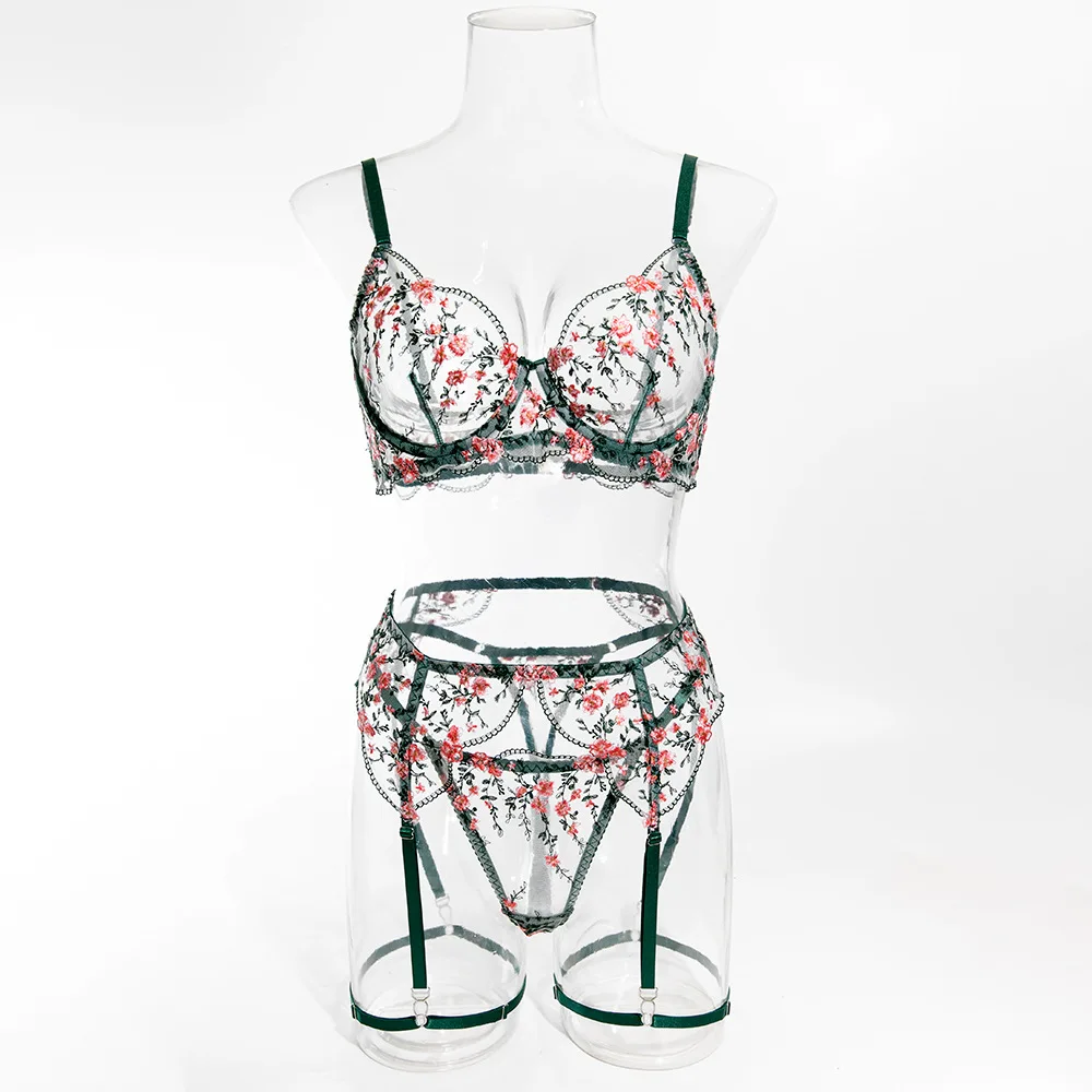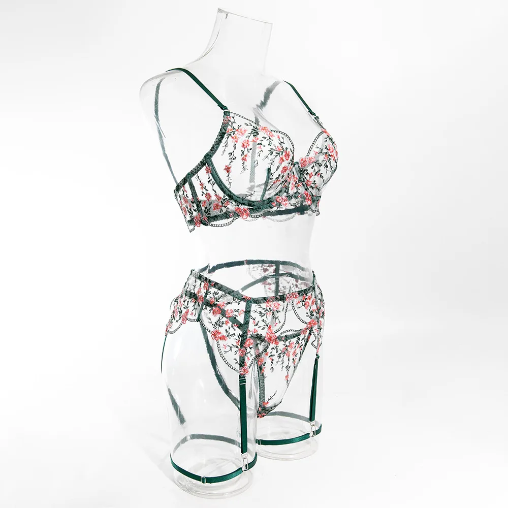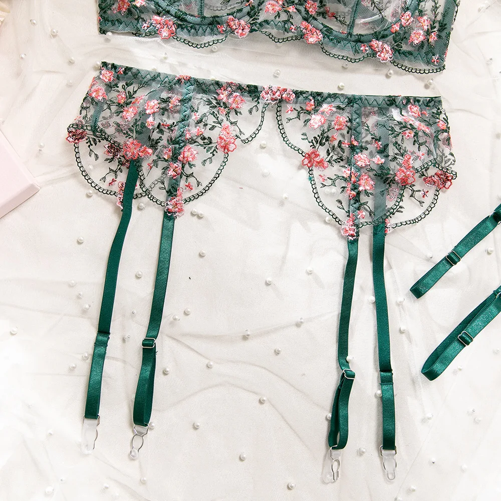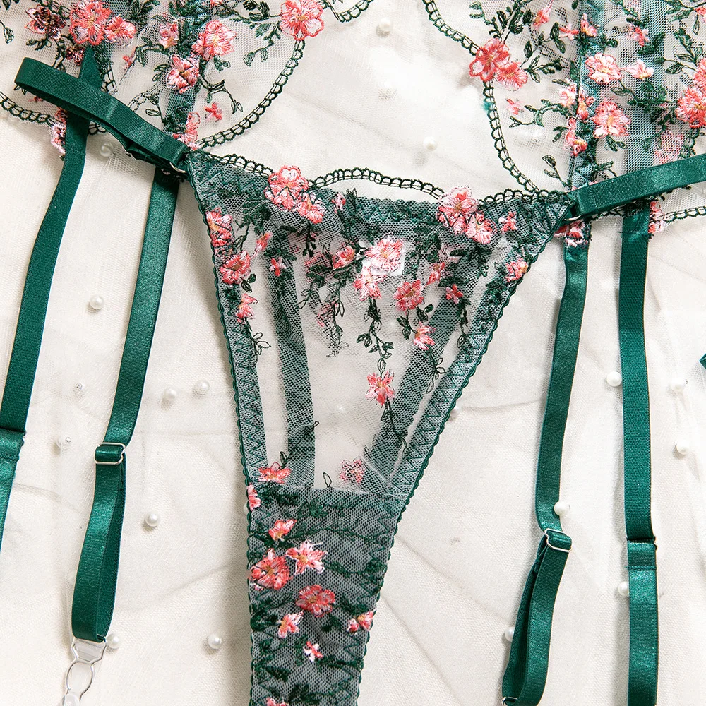 Sublimez votre silhouette avec cet ensemble de lingerie sexy pour femme, 5 pièces, orné d’une broderie florale raffinée et conçu avec un anneau en acier pour un maintien structuré. Son effet perspective transparent met en valeur les courbes avec élégance, tandis que la ceinture assortie et les couvre-jambes complètent le look pour une allure sophistiquée.