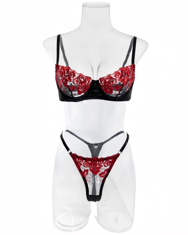 Sublimez votre silhouette avec cet ensemble de lingerie sexy pour femme, inspiré du style glamour iconique. Il associe une broderie florale délicate, une matière transparente raffinée et un soutien-gorge à armatures offrant un maintien flatteur et un galbe naturel. Le string assorti complète l’ensemble pour une allure féminine et élégante.