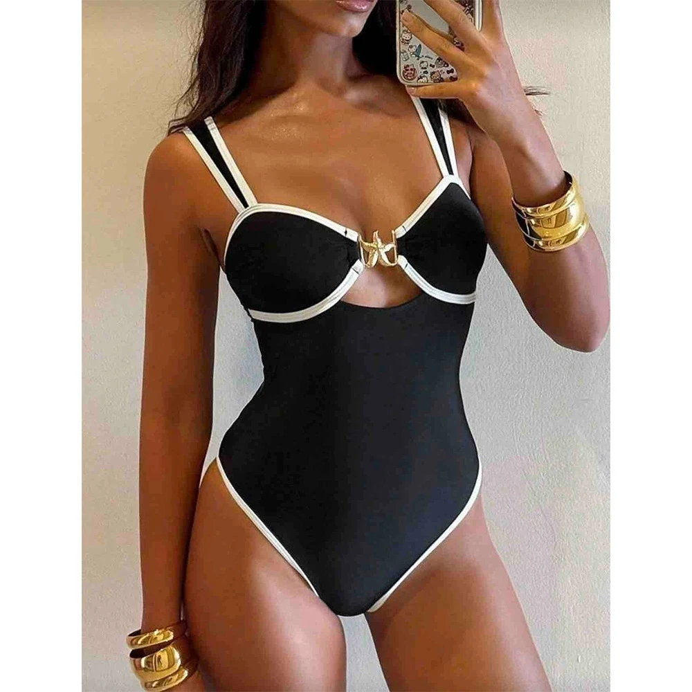 Affirmez votre style avec ce maillot de bain une pièce noir pour femme avec jupe intégrée, conçu pour offrir une silhouette élégante et sculptée. Son design ajouré avec détail étoile de mer métallique apporte une touche moderne et originale.