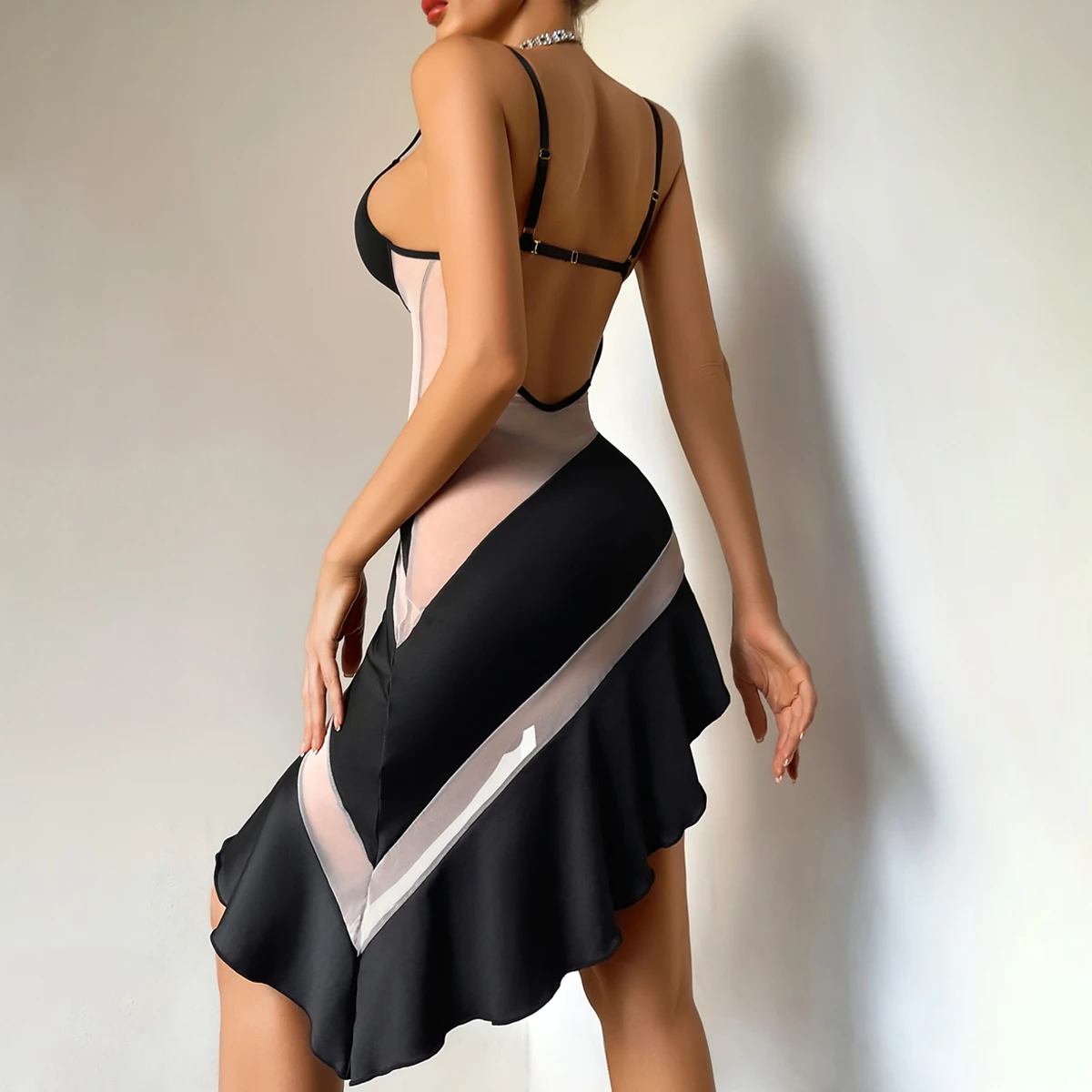 La coupe moulante et irrégulière épouse parfaitement les courbes pour créer un effet sculptant naturel. L’ensemble associe lingerie intégrée et robe légère, offrant un look complet et sophistiqué, idéal pour les occasions spéciales ou les soirées.