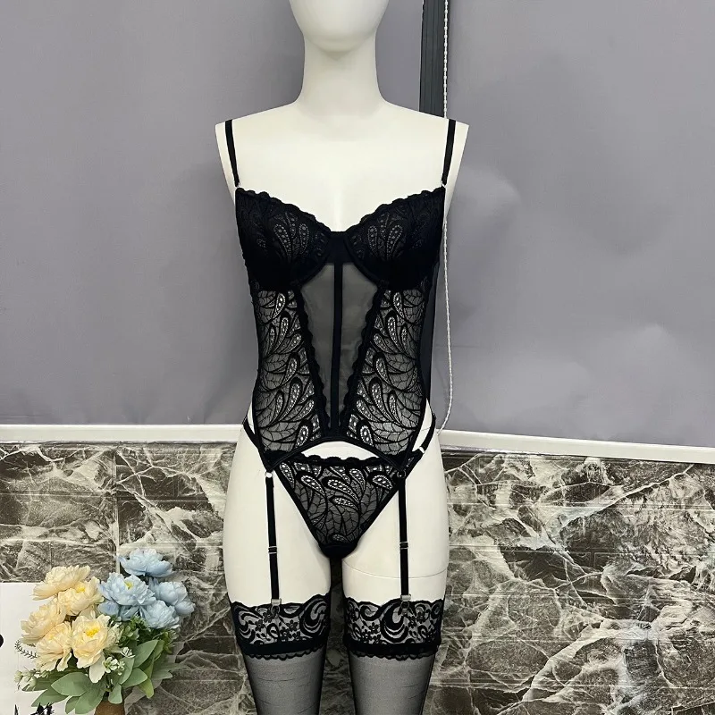 Sexy Lingerie Onesie femmes Sexy dentelle Patchwork maille transparent couleur unie jarretelles