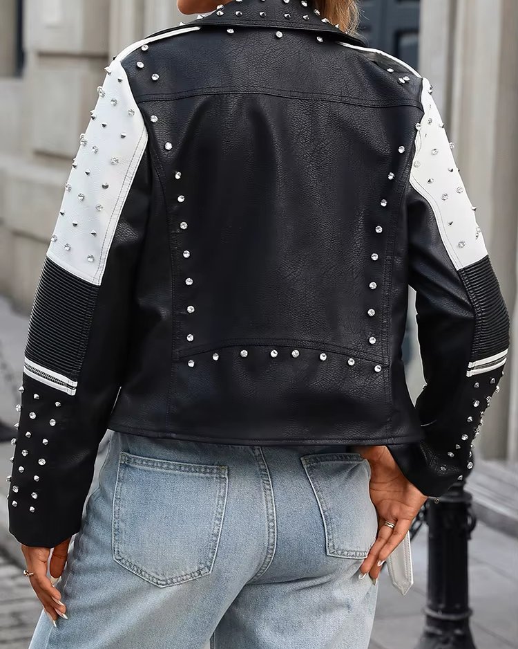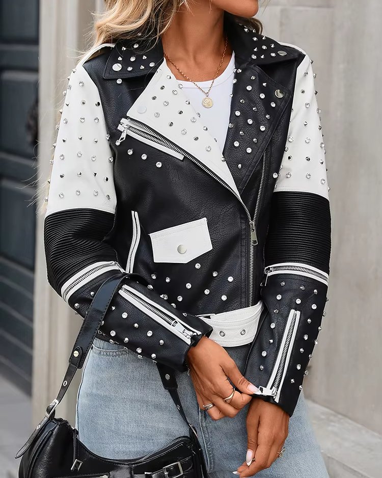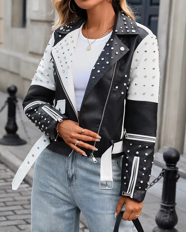 Veste biker femme en similicuir noir et blanc – Style punk avec rivets et ceinture, parfaite pour le printemps et l’automne
