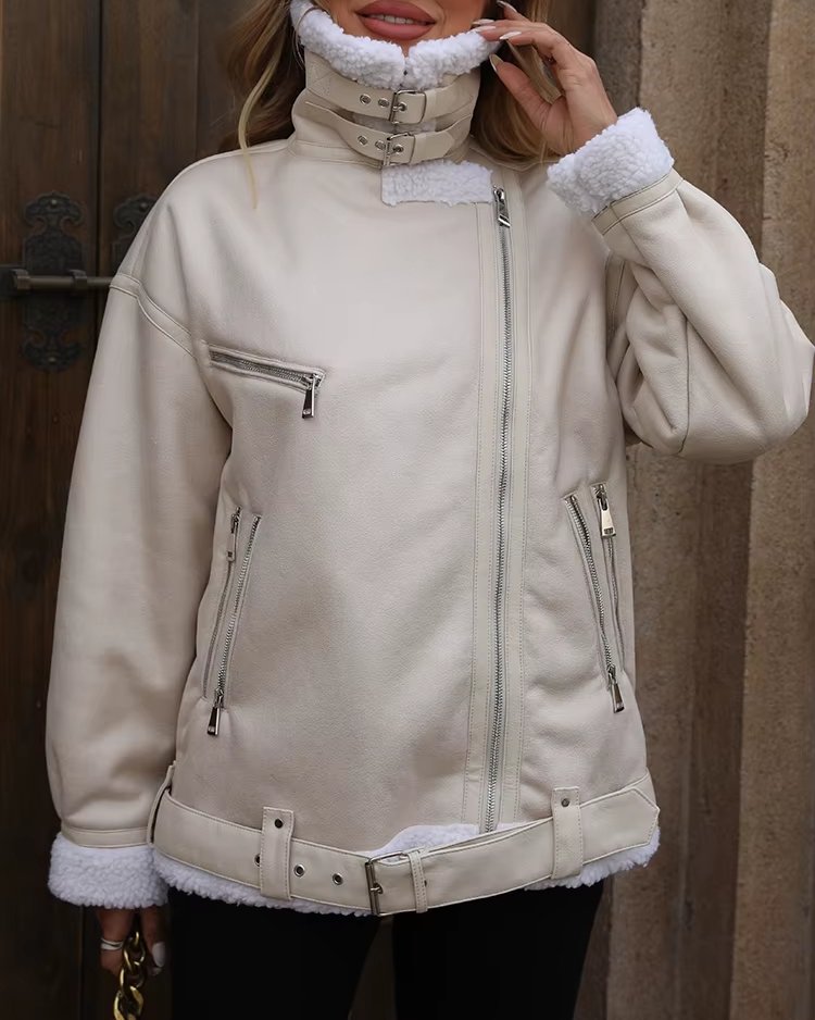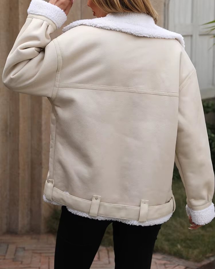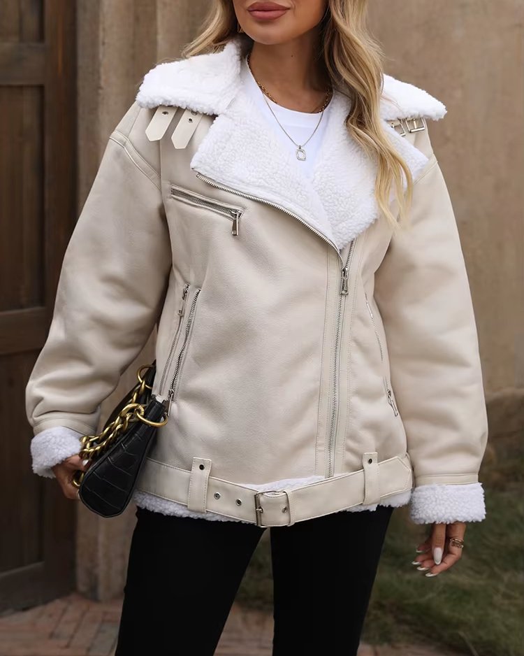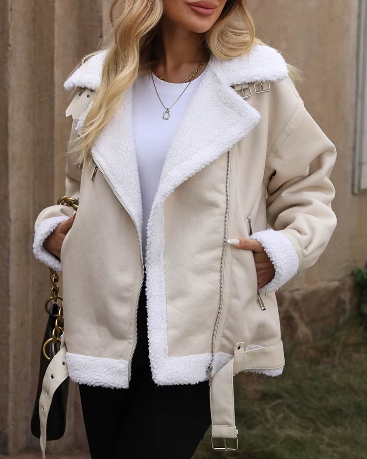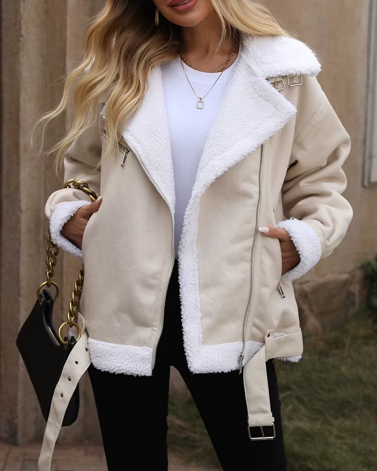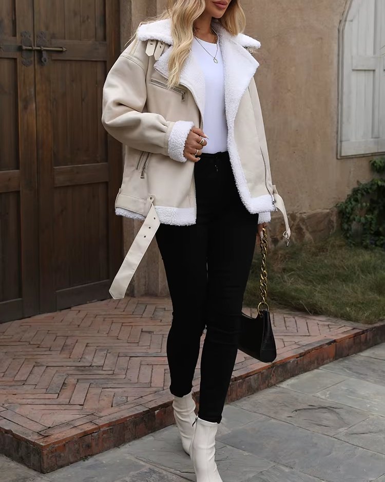 Veste femme automne-hiver en fausse fourrure d’agneau – Style moto biker vintage avec ceinture et fermeture éclair